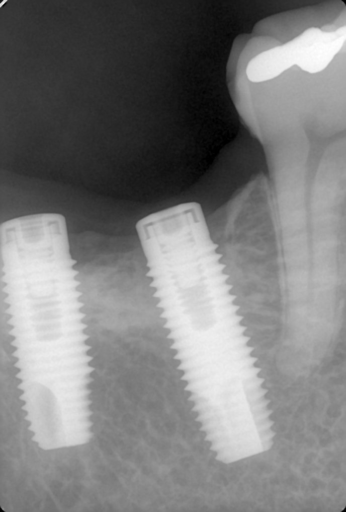 Porfavor, podrían ayudarme a identificar los tres implantes de la radiografía. ¿Que conexión tienen?. ¿Que aditamento de protesis necesitaría para poder rehabilitar los? Gracias