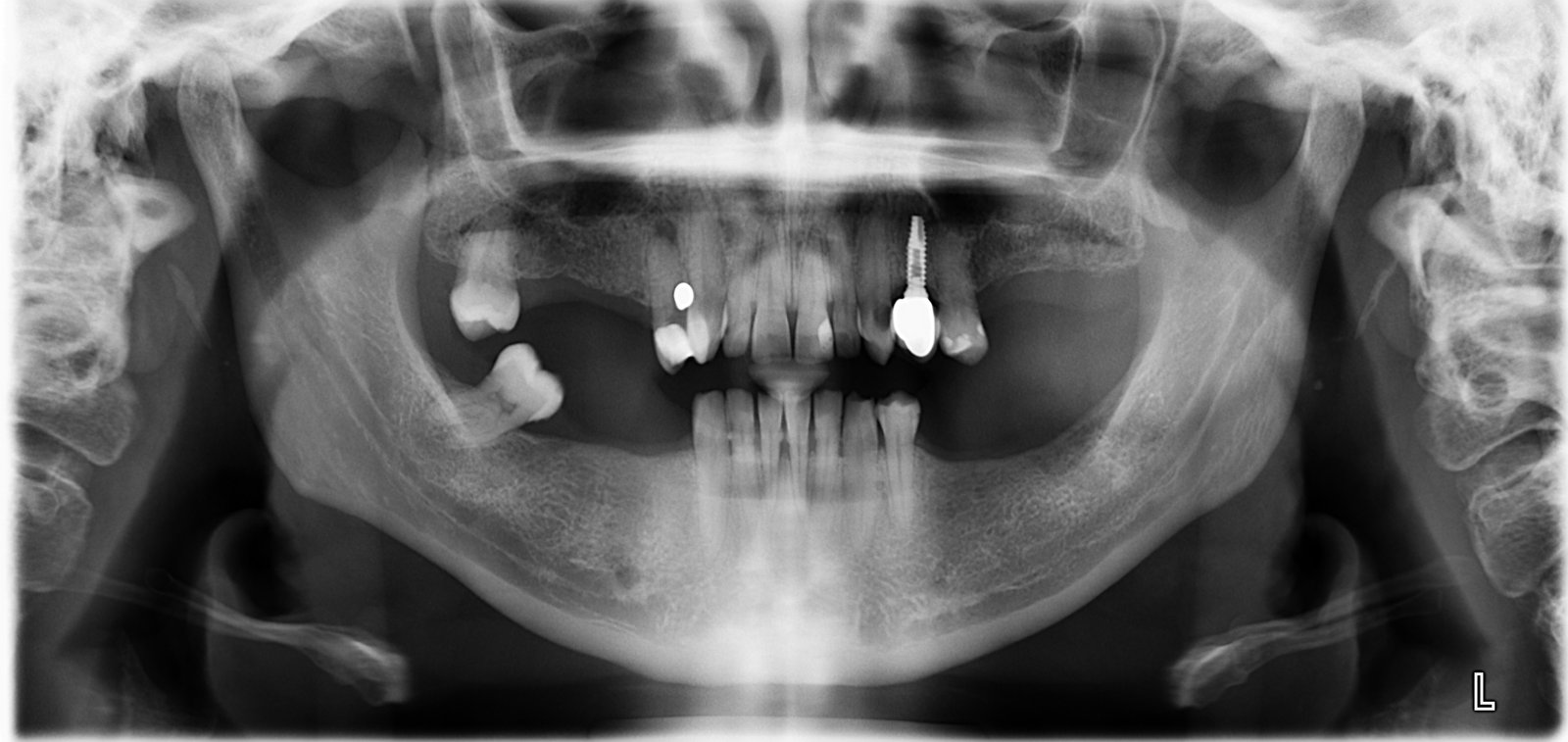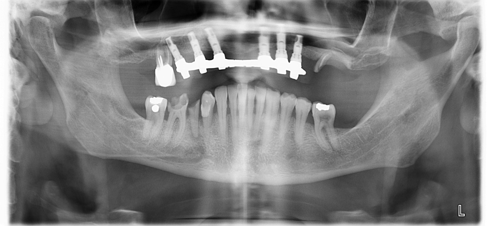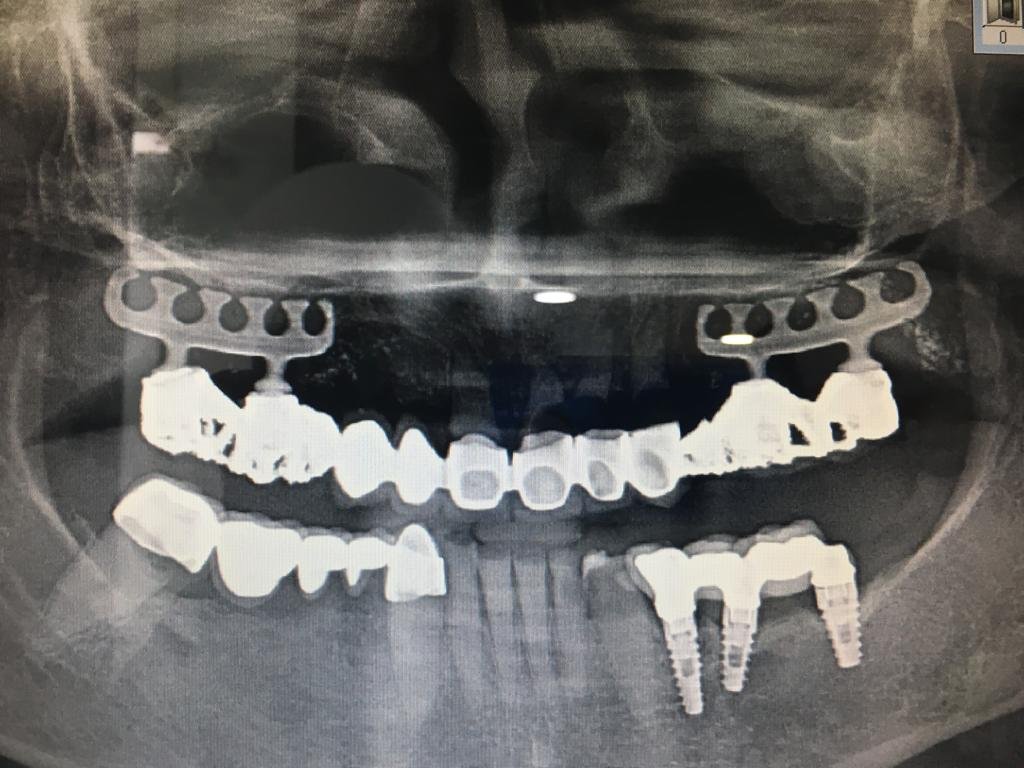 Paciente mujer fumadora de 10 cigarrillos al día, presenta movilidad de rehabilitación superior total con laminas de Linkow bilateral. El tratamiento fue realizado hace 30 años; presenta fistula en palatino. [...]