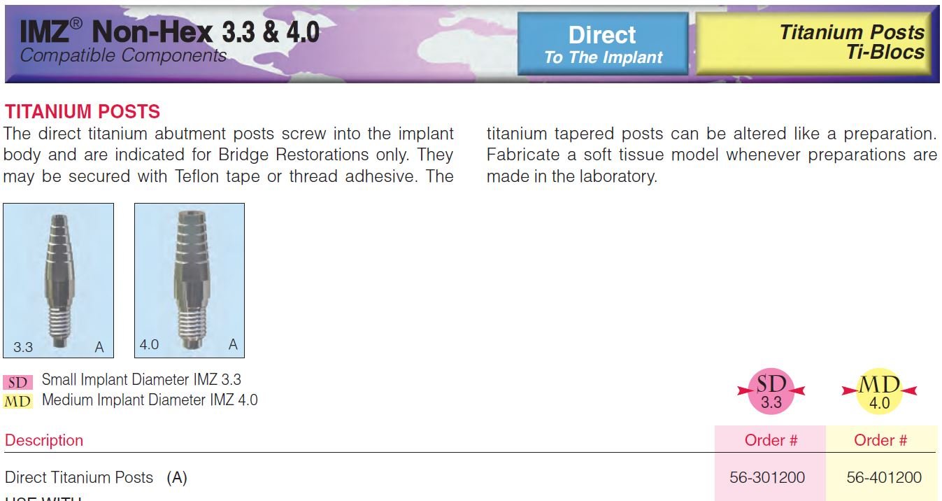 Hi I need this IMZ product. can anyone help me find it ? IMZ Titanium post 3.3 non-hex. small implant diameter order catalog 56301200 Thanks, David